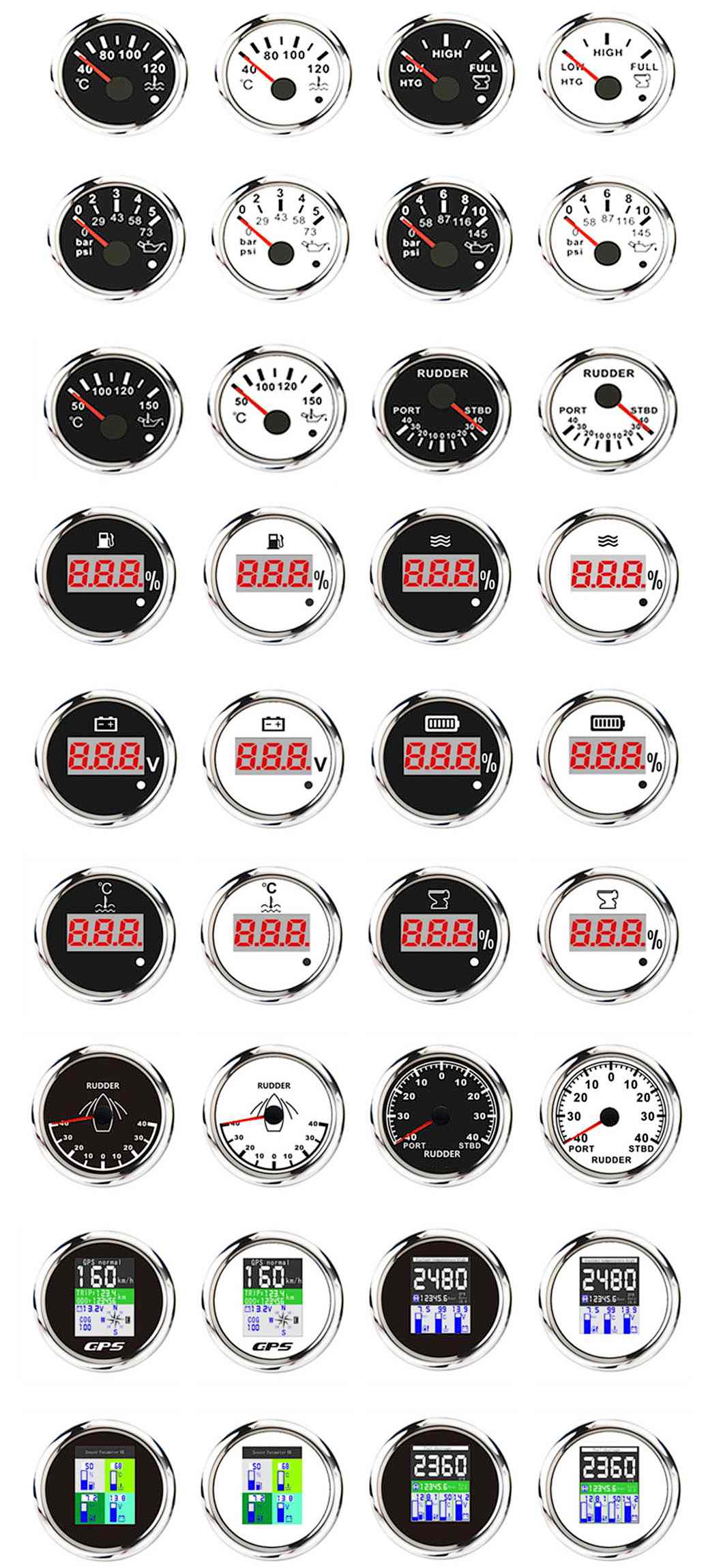 مؤشر الوقود، نظام تحديد المواقع العالمي (GPS)، مقياس درجة حرارة الماء 52 مم، مقياس استهلاك الوقود، مقياس سرعة الدوران، مقياس الجهد، مقياس ضغط الهواء، مقياس الإنذار